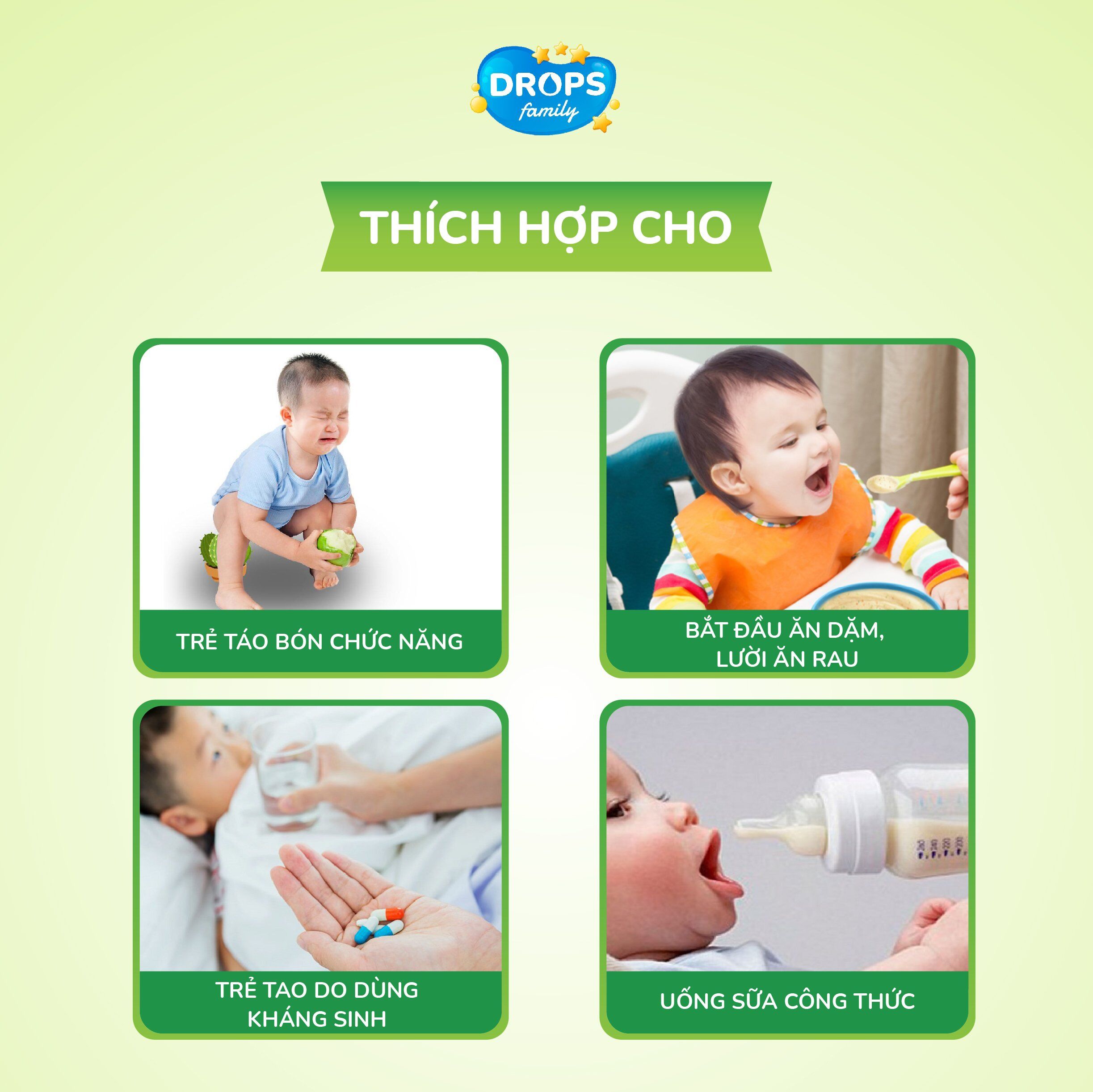 - Trẻ 1 tuổi – 3 tuổi: 3 ml/ngày, sau 1 ngày nếu tình trạng táo cải thiện chậm có thể tăng lên 5 ml/ngày.