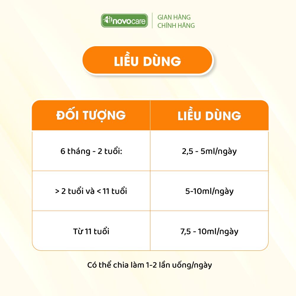 - Trẻ từ 6 tháng-2 tuổi: 2,5-5ml/ngày, có thể chia thành 1-2 lần dùng